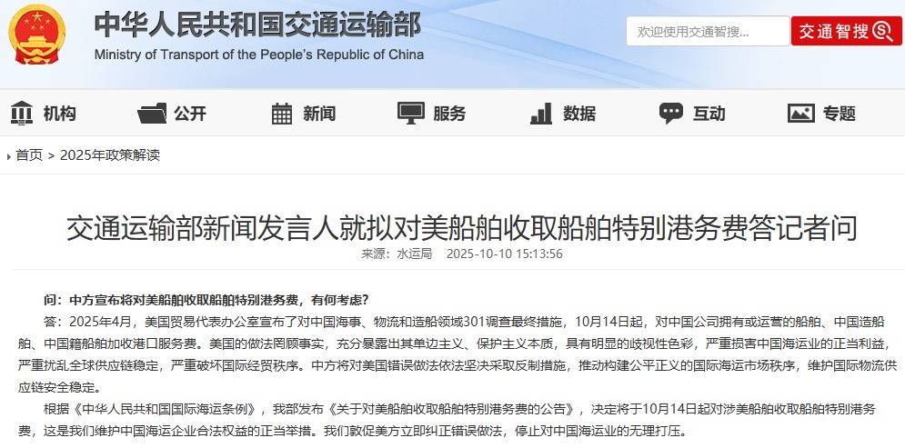 根据《中华人民共和国国际海运条例》,我部发布《关于对美船舶收取船舶特别港务费的公告》,决定将于10月14日起对涉美船舶收取船舶特别港务费,这是我们维护中国海运企业合法权益的正当举措。我们敦促美方立即纠正错误做法,停止对中国海运业的无理打压。